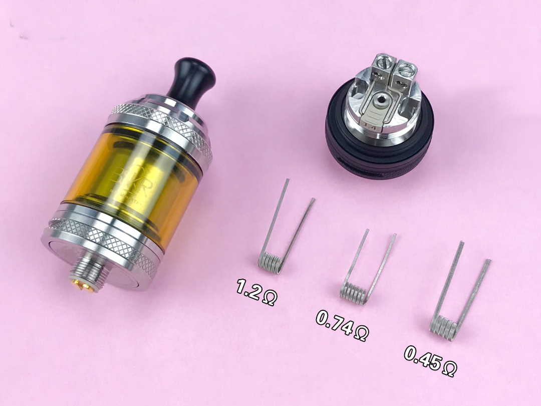 Устройство поставляется с двумя спиралями, тремя дриптипами, комплектом воздушных вставок, запчастями, дополнительной колбой, отвёрткой и инструкцией.
