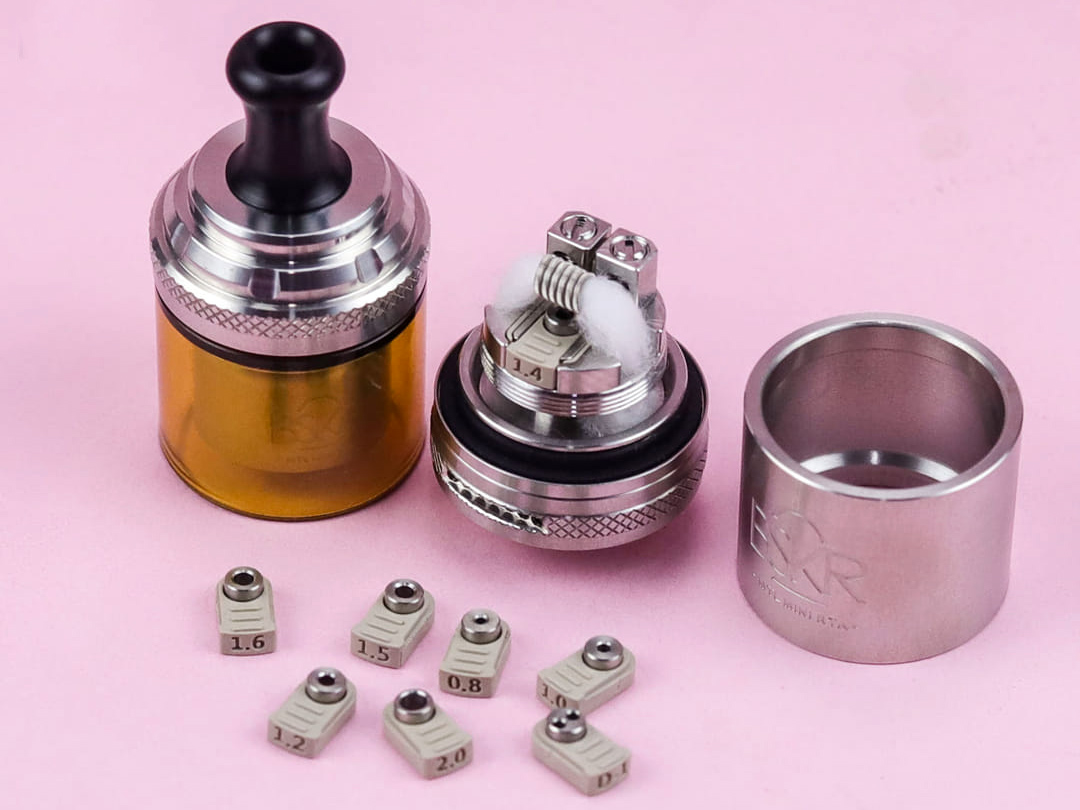 Под куполом находится небольшая дека с двумя прямоугольными стойками, расположенными вплотную друг к другу. Ножки намотки будут фиксироваться в горизонтальной плоскости при помощи пары верхних винтов со шлицами под прямую отвёртку. В центре, под спиралью располагается слот под одну из восьми сменных воздушных вставок с разнокалиберными соплами, отвечающими за нижнюю подачу воздуха. Кроме того, интенсивность обдува можно настраивать поворотом воздушного кольца с семью разнообразными перфорациями. Ёмкость составит 2 либо 2,5 мл в зависимости от выбранной колбы.
