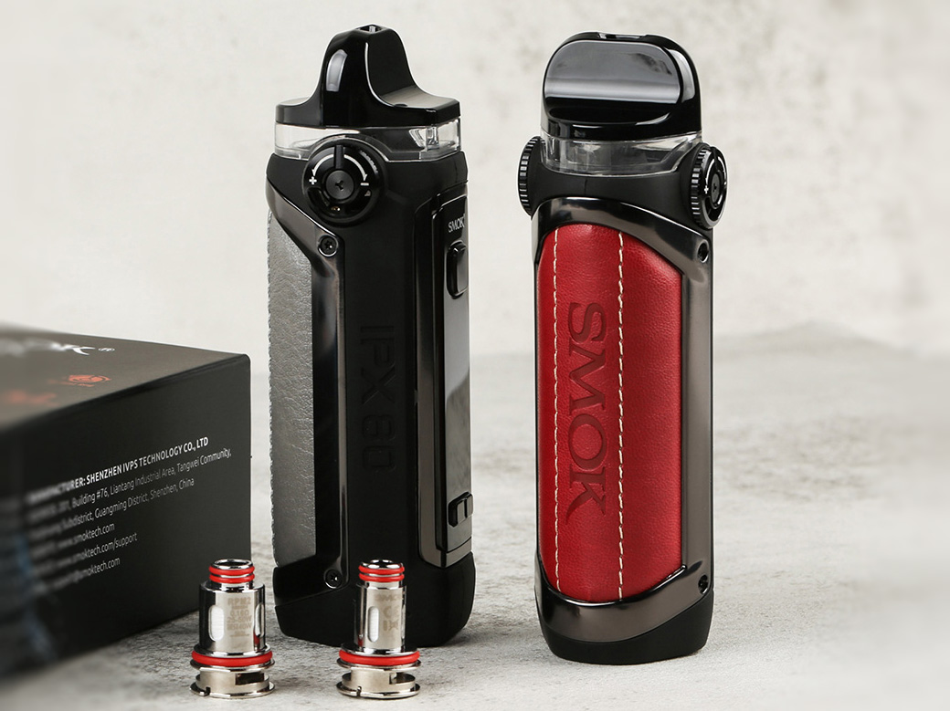 8 января компания Smok представила в инстаграме стартовый набор — IPX 80 Pod Kit. Корпус под-мода наделили эргономичным шестигранным профилем, скромными габаритами и надёжной защитой от ударов и влаги по стандарту IPX6. На выбор предложили широкую гамму расцветок, включающую семь различных цветовых комбинаций. Тыльную сторону облагородили удобной панелью с тисненой кожаной вставкой. На небольшом фасаде разместили кнопку активации, дисплей и пару маленьких клавиш. USB-порт установили на дне и защитили герметичной заглушкой. Сверху, по бокам распредели два вращающихся регулятора для настройки обдува. Между массивным дриптипом и посадочной площадкой предусмотрели крупное окно, позволяющее отслеживать жидкость в баке.