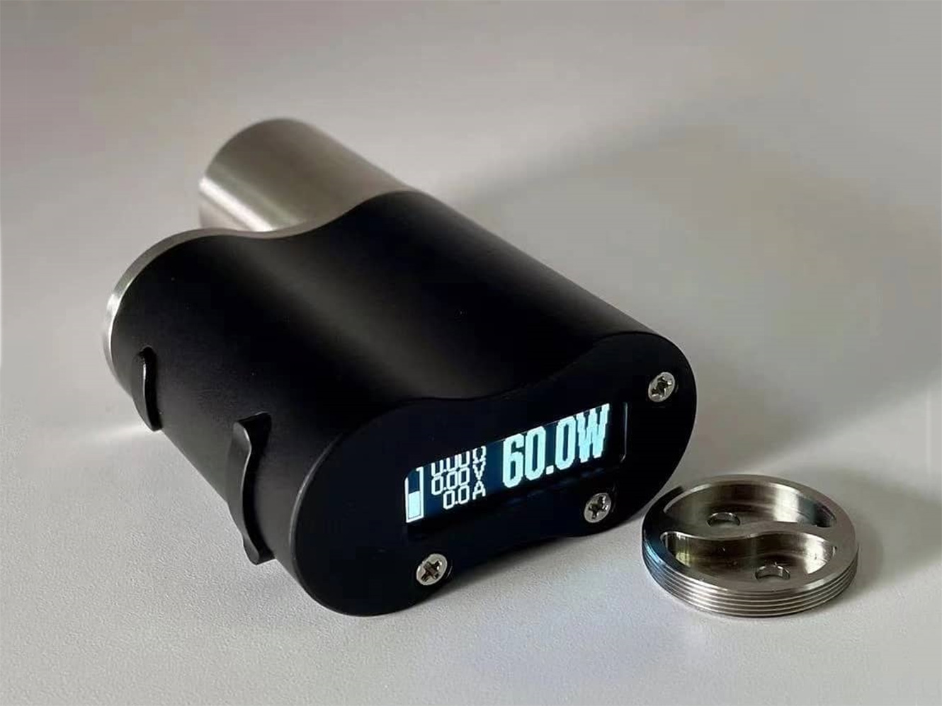Плата располагает стандартным монохромным интерфейсом, вариваттом с диапазоном от 1 до 60 ватт и режимом температурного контроля. Девайс может питаться от двух видов батарей — 18650 либо 18350. Для зарядки придётся извлекать аккумулятор из мода — USB-порт не предусматривается.