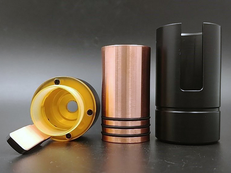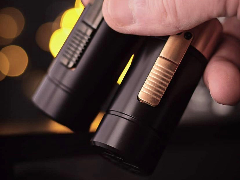 Необычный девайс поддерживает два формата аккумуляторов — 21700 и 20700. Кроме того, предусматривается возможность установки увеличенного тубуса для работы сразу с двумя батареями. Контакт — непостоянный, зажигание осуществляется при нажатии на импровизированную боковую клавишу. Коннектор — гибридный, формата 510. Контактная группа изготавливается из меди.