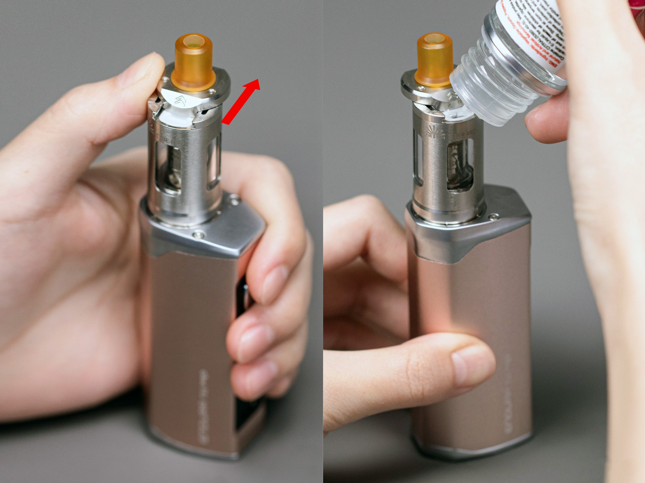 В паре с модом идёт минималистичный необслуживаемый бак с двумя испарителями на 1,7 Ом. Стеклянная колба дополняется защитным стальным каркасом с четырьмя окнами. Объём резервуара составляет 2 мл. Заправочное отверстие находится сверху, под сдвигающейся крышкой с узким 510-м дриптипом.