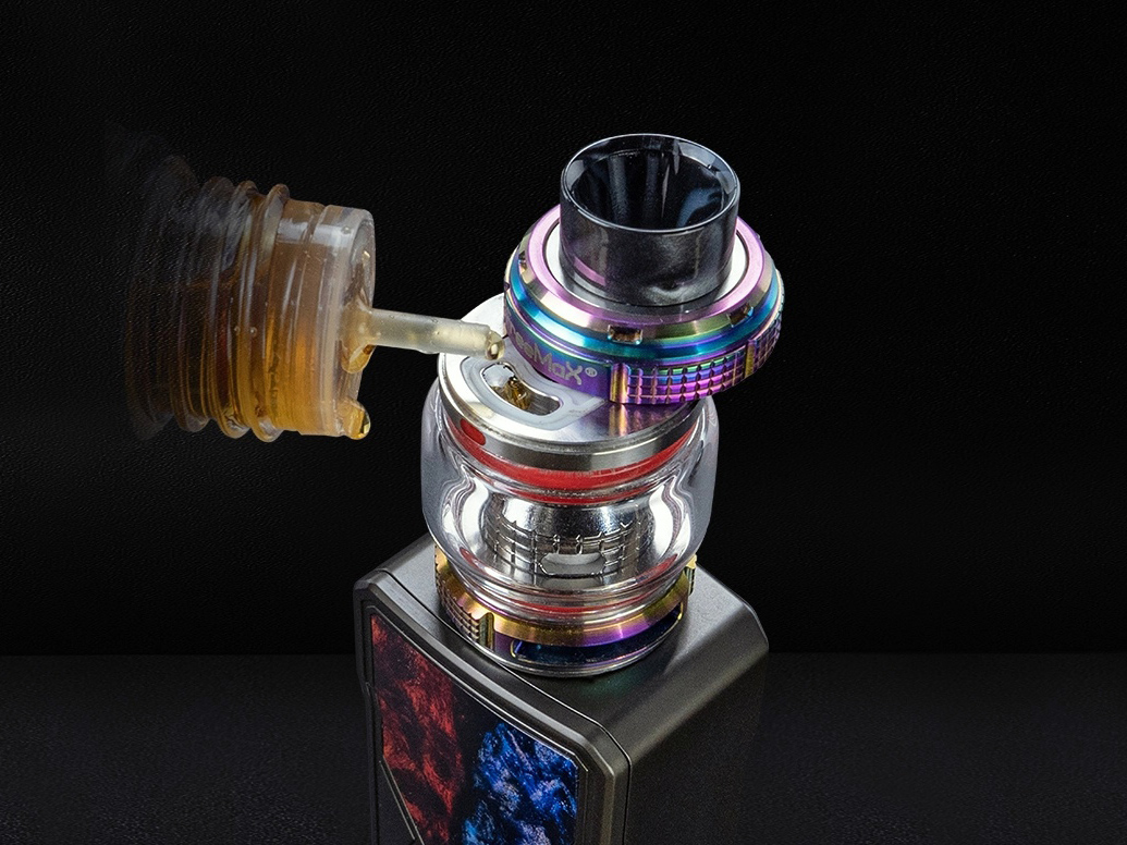 Внутри, на необслуживаемой базе восседает сменный испаритель из линейки FM COILTECH4.0 с двумя плетенными сетками и сопротивлением в 0,2 Ом. Помимо того, девайс предусматривает резервный экземпляр с одной сеткой на 0,15 Ом, а также возможность работы с разнообразными вариантами из предыдущих серий. Интенсивность обдува можно настроить вращением нижнего кольца. Заправка осуществляется сверху, через дугообразное отверстие под сдвигающейся крышкой. Объём можно увеличить с 2 до 5 мл при помощи расширенного стекла.