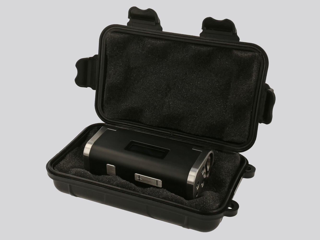 4 января Smokerstore представили на своём сайте новый боксмод — Taifun Box Pro, разработанный совместно с одноимённой компанией. Классический девайс собрали из лёгких термостойких полимеров и усилили рамой из высококачественной нержавеющей стали. Выбор расцветок ограничили двумя вариациями — серебристой и чёрной. Минималистичный корпус наделили относительно компактными габаритами и плавной прямоугольной формой с эргономично скругленной тыльной стороной. Стальную посадочную площадку ограничили шириной стенок мода в 25 мм. На узком фасаде разместили маленькую квадратную кнопку активации и клавишу «+/-». Сбоку установили небольшой дисплей. Доступ к батарее ограничили съёмной крышкой, фиксирующейся на резьбе.