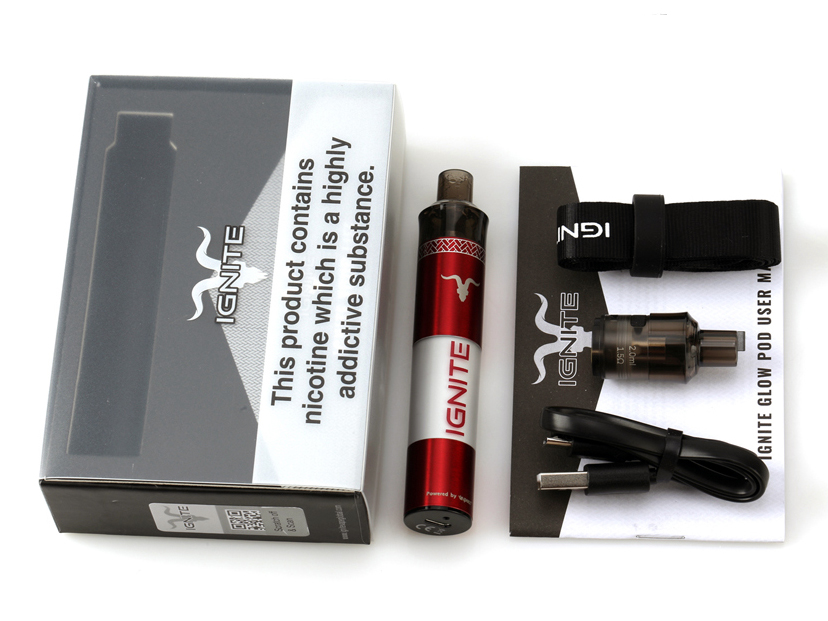 25 марта в ряде интернет-магазинов появился all-in-one девайс — Glow Pod Kit, разработанный китайской компанией Ignite. Под-систему облачили в длинную цилиндрическую форму без кнопок. Основным материалом избрали нержавеющую сталь. В качестве декора реализовали динамичную неоновую подсветку. Помимо того, корпус украсили лаконичной гравировкой. На выбор предложили пять вариантов окраса. По бокам распределили пару мелких перфораций, отвечающих за забор воздуха. Сверху разместили крупный прозрачный картридж со встроенным дриптипом. Дно укомплектовали индикатором и USB-портом.