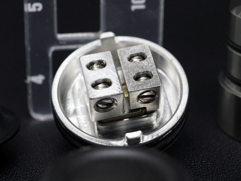 Центр базы занимает массивная квадратная платформа с четырьмя слотами для фикcации одной спирали. Ножки намотки устанавливаются в вертикальной плоскости и зажимаются по бокам винтами под прямую отвертку. Купол неподвижно фиксируется на стенках базы при помощи пары выступов и двух орингов. Интенсивность обдува настраивается поворотом кольца. Высокие борты вкупе с просторным дном образуют довольно вместительный резервуар. Кроме того, можно установить сквонк-пин для нижней подачи жидкости.