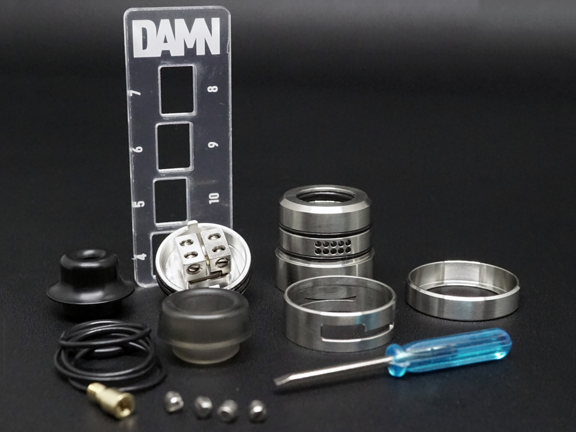 Девайс поставляется с двумя дриптипами, спиралью, запасными деталями, отвёрткой, трафаретом, BF-пином и инструкцией.