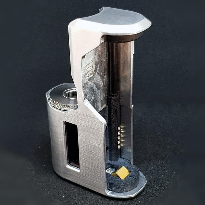 За тонкими алюминиевыми стенками трудится плата от Evolv — DNA60. Мощность на выходе может достигать значения в 60 ватт. При необходимости можно переключиться на температурный контроль либо bypass. Диапазон сопротивления составляет от 0,1 до 3,0 Ом. За питание отвечает внешняя батарея формата 18650. Предусматривается съемный USB-порт, однако, он предназначается исключительно для обновления прошивки платы.