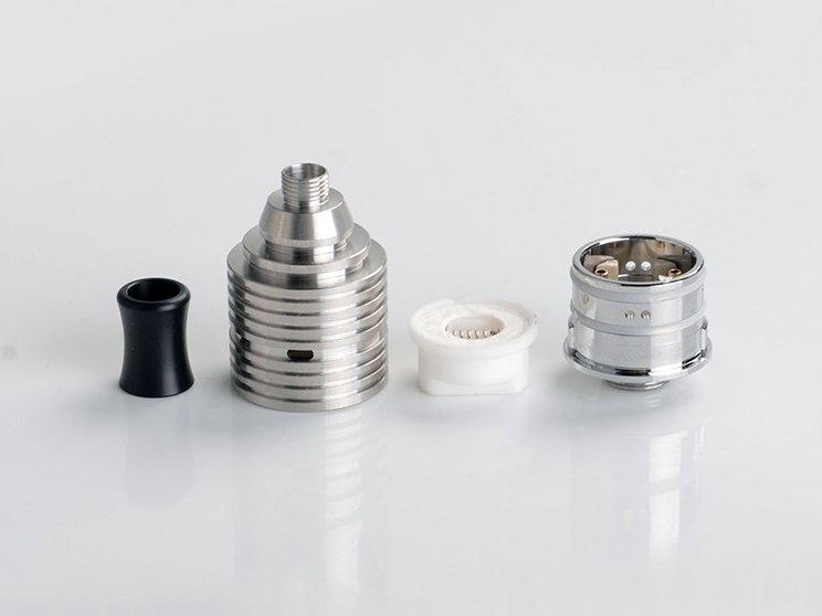 Комплектная дрипка использует сменный керамический испаритель с намоткой на 0,6 Ом. Жидкость из картриджа поступает автоматически после нажатия кнопки активации. Интенсивность обдува можно настроить вращая купол относительно базы.