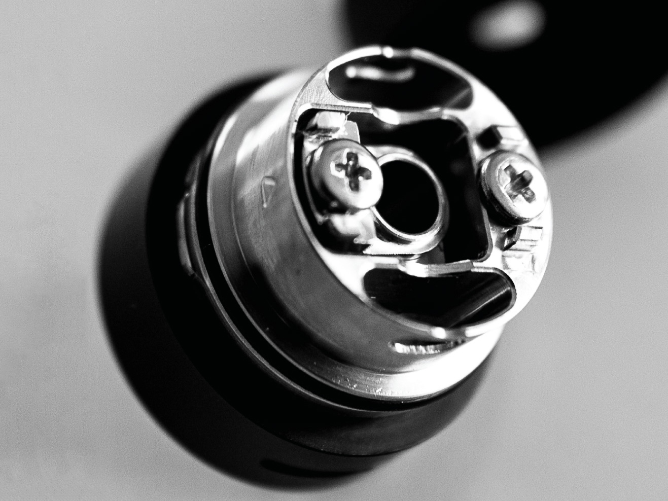 Базу представляют две коренастые стойки с низкими бортами. Ножки спирали фиксируются в горизонтальной плоскости при помощи пары широких винтов под крестовую отвертку. На периферии располагаются глубокие ванночки для ваты. Интенсивность подачи жидкости в испарительную камеру регулируется поворотом верхней части бака относительно основания. В центре, под намоткой находится крупное круглое отверстие, отвечающее за подачу воздуха. Для наибольшей вариативности обдува предусматриваются четыре сменные вставки с разнокалиберными отверстиями. Помимо того, затяжку можно настроить посредством вращающегося нижнего кольца. Объем резервуара составит 2 либо 3,4 мл в зависимости от выбранной колбы.