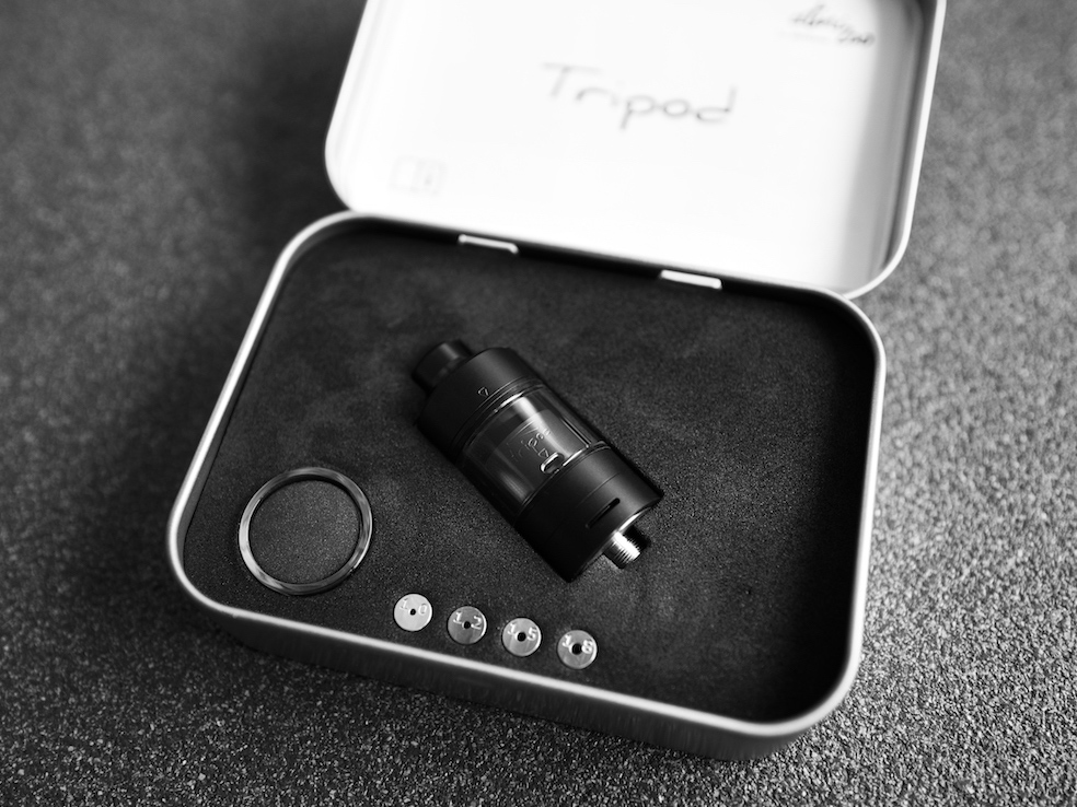 Компания Atmizoo выпустила Tripod DLC RTA. Это необычный обслуживаемый бак с просторной базой под одну спираль, набором сменных воздушных вставок и регулируемой подачей жидкости.