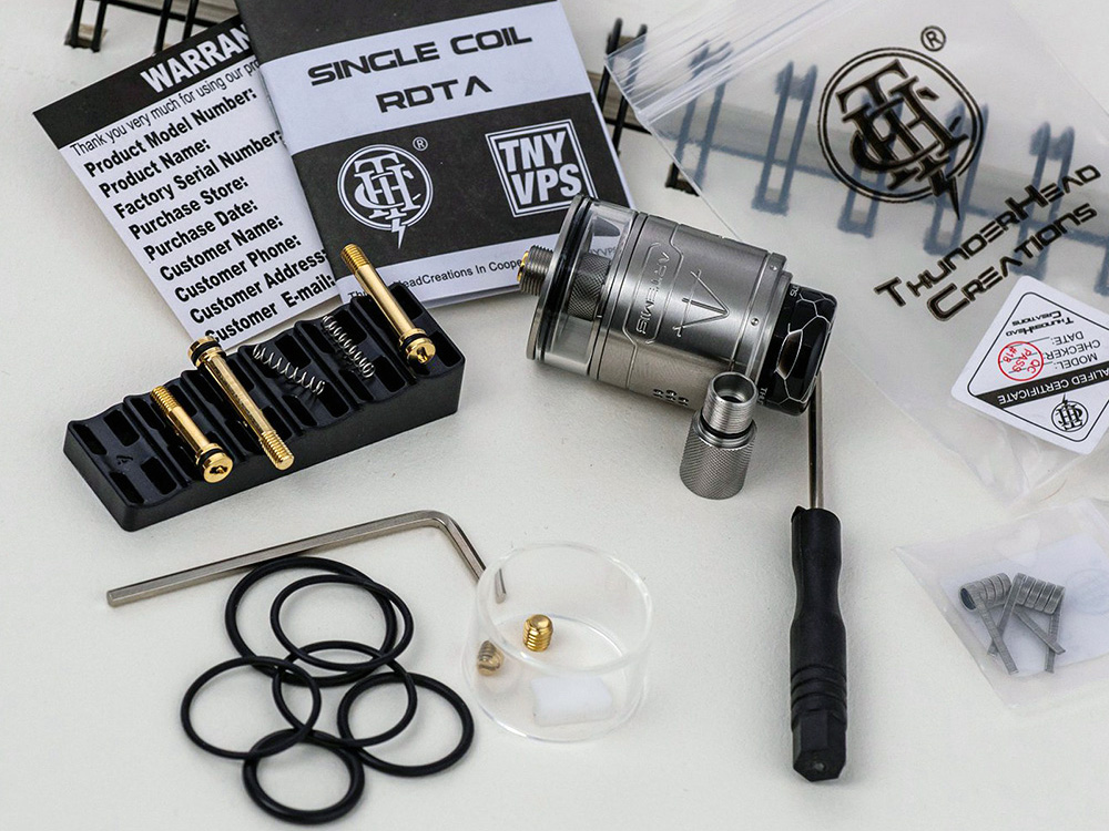 Бак поставляется с парой спиралей, хлопком, комплектом запчастей, втулкой, дополнительной колбой, ключом, отверткой, BF-пином и инструкцией.