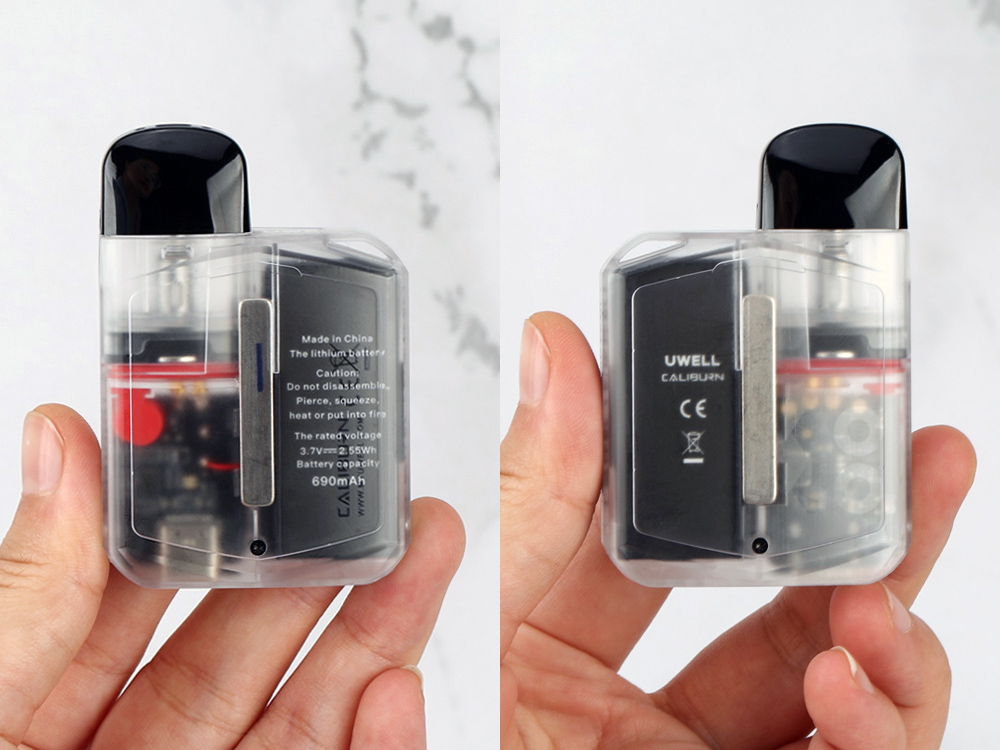 Зажигание осуществляется при помощи воздушного активатора. Минималистичная плата предусматривает все необходимые меры безопасности и максимальную мощность на выходе в 18 ватт. Работа обеспечивается за счет интегрированной батареи емкостью 690 мАч. За быструю зарядку током в 1,6 отвечает USB Type-C. Магнитный картридж комплектуется сменным испарителем из серии Caliburn G на 1,0 Ом. В дополнение к нему, в запасе предусматривается сеточный вариант из линейки UN2 с сопротивлением в 0,8 Ом. Объем резервуара составляет 2 мл. Для переключения обдува необходимо установить картридж другой стороной.