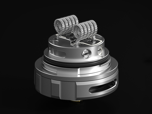 Внутри находится просторная бесстоечная дека с четырьмя прорезями и широкой решеткой обдува. Ножки спиралей следует фиксировать в вертикальной плоскости при помощи боковых винтов с прямыми шлицами. Обдув поступает на намотку через два изолированных канала — снизу и с боков. Регулировка интенсивности осуществляется при помощи двух вращающихся колец. Объем можно увеличить с 2 до 5,5 мл при помощи расширенной колбы. Заправочные отверстия находятся сверху, под съемной крышкой.