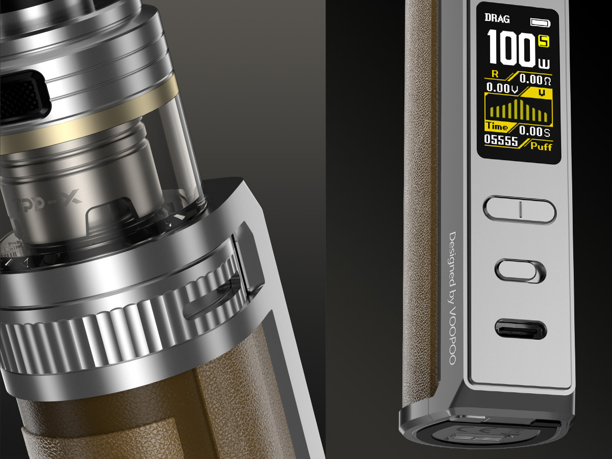 12 августа компания Voopoo анонсировала в инстаграме универсальный стартовый комплект — Drag X Pro Pod Mod. Корпус девайса исполнили в формате цинкового цилиндра с прямоугольным подточенным модулем, растянутым вдоль боковой стенки. Палитру расцветок собрали из семи вариаций, представляющих собой сочетания металлических оттенков каркаса и яркой кожаной отделки. На лицевой стороне расположили круглую кнопку активации, прямоугольный дисплей, две клавиши управления, блокиратор и USB-порт. Тыльную сторону украсили крупным фирменным тиснением. Под посадочной площадкой предусмотрели рифленое кольцо, отвечающее за забор воздуха. Ко дну пристроили откидную крышку, скрывающую батарейное ложе.