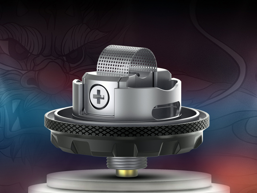 Центр базы занимает массивная конструкция, состоящая из двух крупных прижимных пластин и подпружиненной керамической платформы. В качестве намотки надлежит использовать сетку. Концы следует вертикально установить между пластинами и зафиксировать при помощи винтов под крестовую отвертку. Хлопок прижимается к сетке посредством изогнутой центральной рампы. По бокам предусматриваются вместительные резервуары. Воздушные потоки поступают на намотку сверху, под углами. Широкую колбу емкостью 8 мл можно заменить уменьшенной цилиндрической версией на 6 мл.