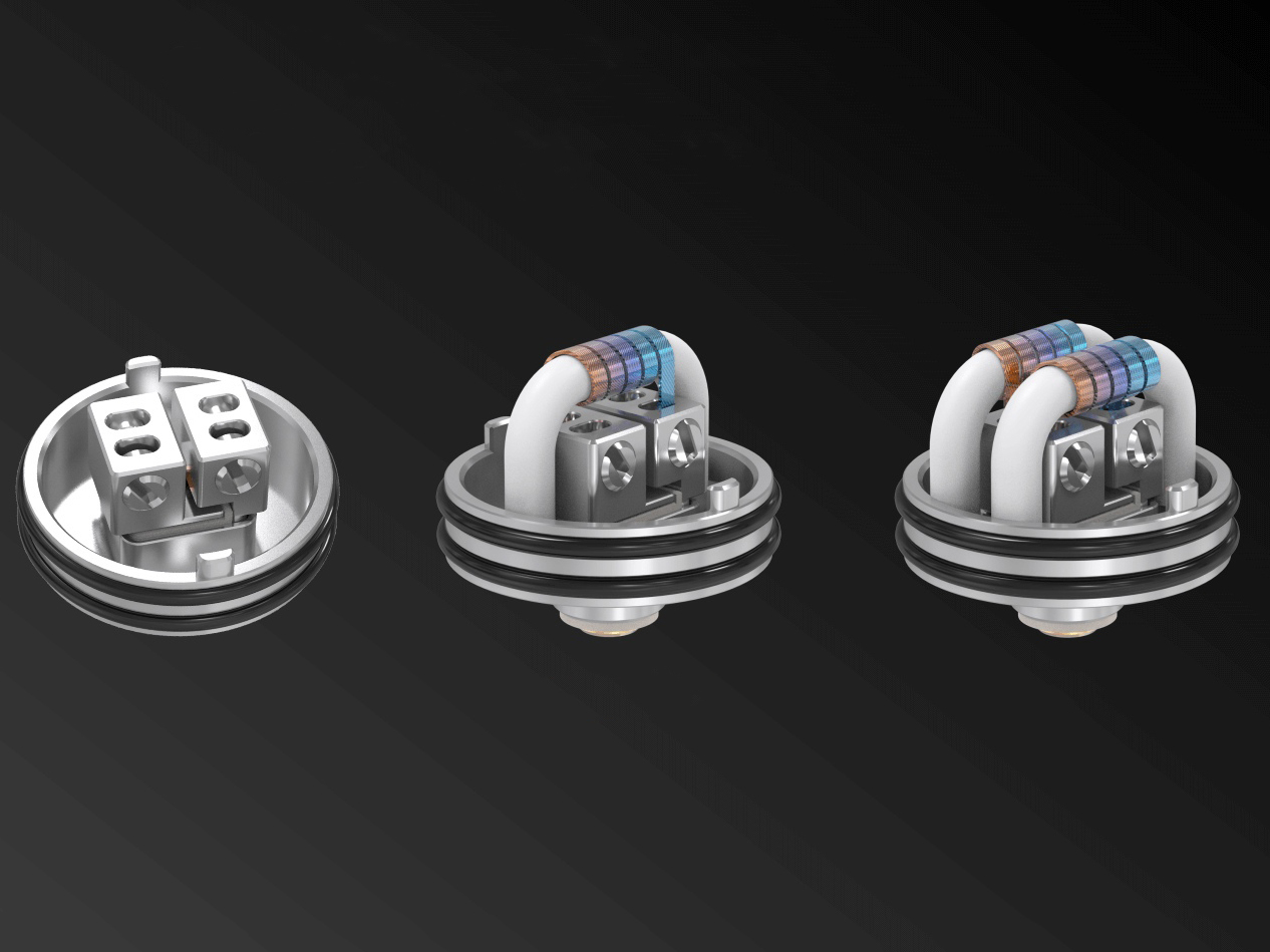 Под куполом находятся две широкие стойки, образующие строгую квадратную платформу для установки одной либо двух спиралей. Ножки располагаются вертикально в овальных слотах и фиксируются при помощи боковых винтов под прямую отвертку. Боковой обдув регулируется путем вращения кольца относительно стенок юбки. Высокие борты базы вкупе с глубокой ванночкой образуют резервуар объемом 1,5 мл. Помимо стандартного пина, предусматривается вариант для работы со сквонкерами.