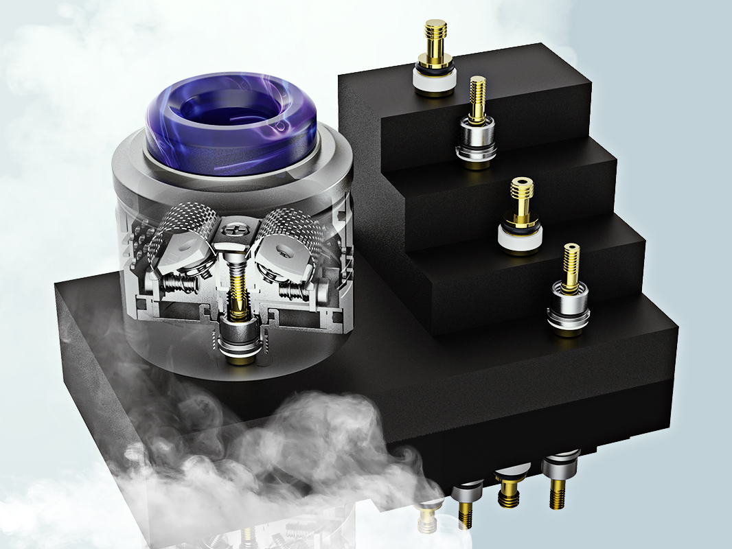 Под куполом скрывается объемная база с угловатой конструкцией, состоящей из трех прижимных пластин для фиксации двух сеток и пары подпружиненных керамических площадок под вату. Намотка устанавливается под небольшим углом и зажимается при помощи трех винтов под крестовую отвертку. Цепь можно реализовать как в параллельном так и последовательном варианте благодаря позолоченным сменным пинам с различной изоляцией. В дополнение ко всему, предусматриваются пины для нижней подачи жидкости. Просторный резервуар позволяет уместить не менее 3 мл жидкости. Боковой обдув регулируется путем вращения крышки относительно юбки.