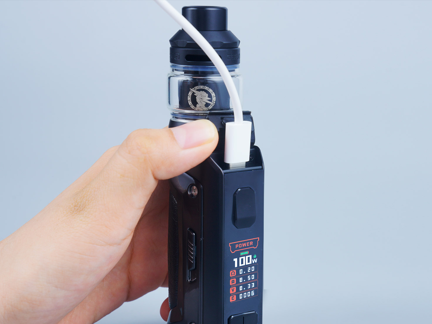 За управление и безопасность отвечает функциональная плата с цветным интерфейсом и максимальной мощностью в 100 ватт. Для работы необходима одна внешняя батарея формата 18650. Зарядку следует производить через USB Type-C током в 2А. Сопротивление намотки может варьироваться в пределах от 0,1 до 3,0 Ом.