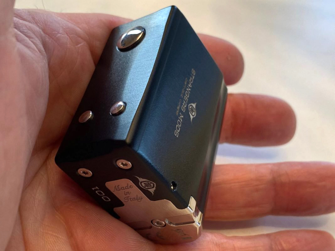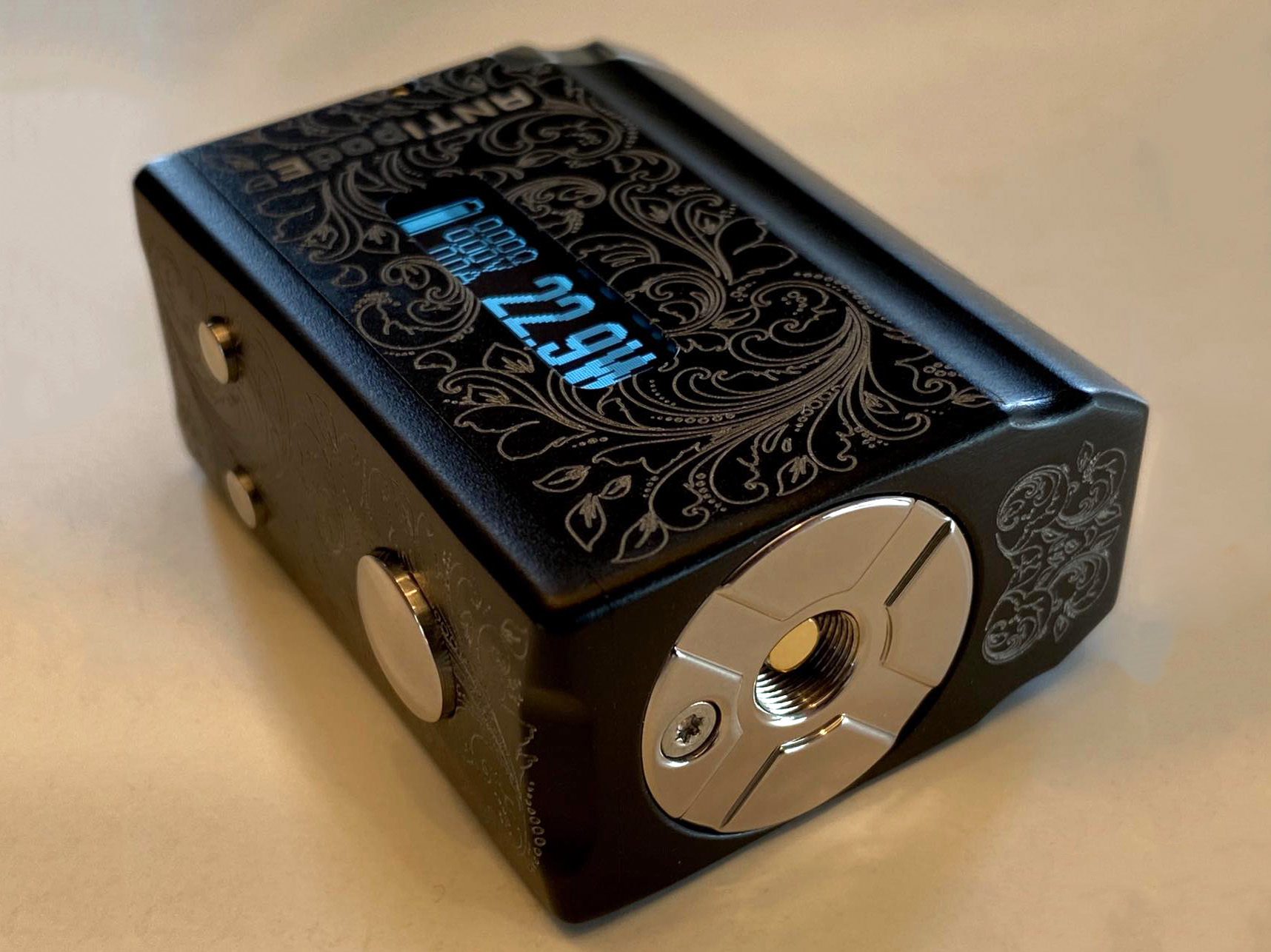 Летом 2021 итальянская компания Strangers Mods представила на странице в фейсбуке нетривиальное устройство — ANTIpodE Mod. Боксмоду дали оригинальный сверхкомпактный корпус с удобной прямоугольной формой, скругленной под хват. В качестве основного материала избрали анодированный алюминиевый сплав. Легкий темный каркас покрыли контрастной гравировкой, представленной не менее чем в трех вариациях. На узком фасаде установили круглую кнопку зажигания и пару небольших регулировочных клавиш. Скругленную тыльную сторону дополнили декоративными перфорациями, обнажающими аккумулятор. Дисплей разместили на одном из широких торцов. Посадочную площадку обеспечили солидным диаметром в 24 мм и снабдили крестообразными протоками, защищающими от прикипания. Ко дну пристроили откидную крышку, отвечающую за доступ к батарейному отсеку.