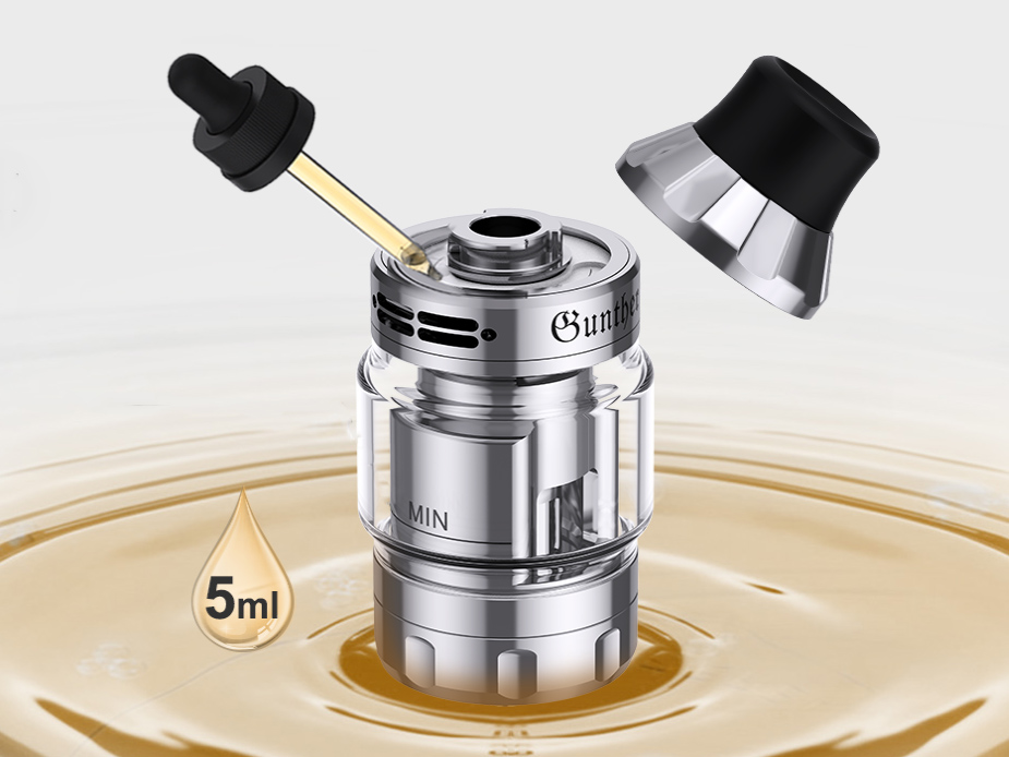 Комплектный бак Gunther Tank представляет из себя классическую необслугу с герметичным верхним обдувом. Заправочное отверстие находится под съемной крышкой со стандартным 810-м дриптипом. В запасе предусматриваются два различных испарителя с сопротивлением в 0,2 и 0,3 Ом. Вместо цилиндрической колбы на 3,5 мл, можно установить расширенный экземпляр емкостью 5 мл.
