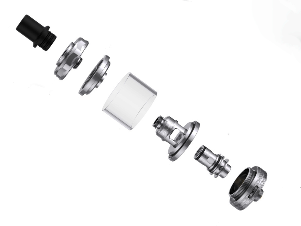 Внутри, на необслуживаемой базе располагается сменный испаритель на 0,8 Ом из новой запатентованной линейки FreeCore с дополнительной ножкой для ускоренного и равномерного нагрева. Кроме того, в запасе предусматривается дополнительный экземпляр с сопротивлением в 1,2 Ом. Интенсивность тугого обдува можно детально настроить благодаря воздушному кольцу с пятью разнокалиберными перфорациями. Резервуар вмещает 2 мл жидкости. Заправка осуществляется сверху.