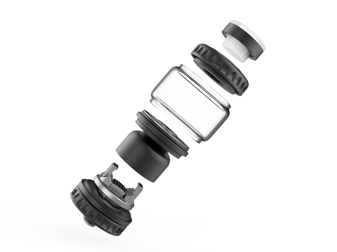Под куполом находится необычная база, собранная из двух крупных изрешеченных стоек и четырех слотов под две спирали. Ножки спиралей следует разместить в прорезях, под углом в 45 градусов и зажать винтами под шестигранный ключ. Пара изогнутых боковых стоек и широкая нижняя решетка образуют систему объемного обдува в 272 градуса, практически по всей поверхности намотки. По периферии размещаются две сквозные ванночки для укладки концов ваты. Помимо цилиндрической стеклянной колбы на 3,8 мл, предусматривается альтернативная расширенная версия на 6,2 мл из ударостойких полимеров.