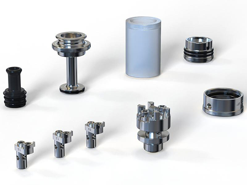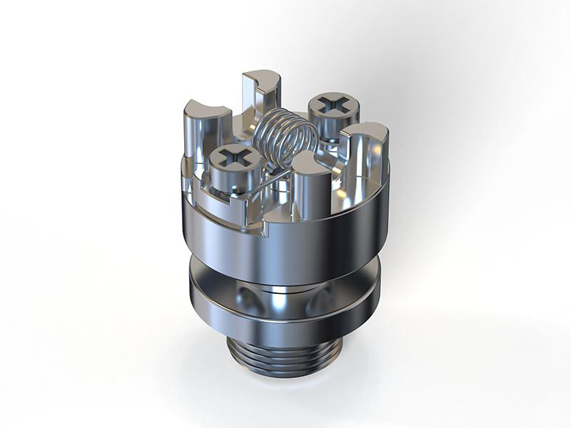 Небольшую базу представляет пара приземистых стоек и две высокие рампы, предназначенные для укладки концов хлопка. Ножки спирали следует разместить в горизонтальной плоскости и прижать сверху шляпками винтов со шлицами под крестовую отвертку. Обдув будет подаваться на намотку снизу, через съемную воздушную вставку. Для вариативности затяжки на выбор предлагает четыре экземпляра с разнокалиберными перфорациями на 1,5; 1,3; 1,1 и 0,9 мм. Резервуар обладает стандартным объемом в 2 мл. Заправка производится снизу, через дно колбы.