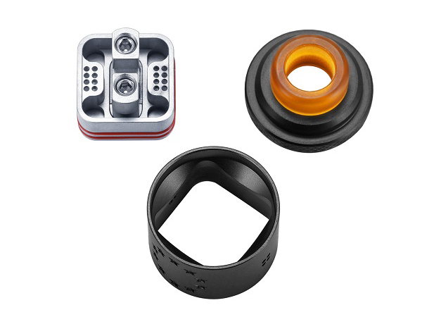 На нетривиальной квадратной базе возвышаются две прямоугольные стойки под пару спиралей. По бокам находятся широкие платформы с мелкими круглыми отверстиями, отвечающими за подачу воздуха на намотку. Ножки следует горизонтально разместить в слотах и прижать сверху винтами под шестигранный ключ. Обдув можно реализовать как в свободном, так и тугом стиле благодаря сменным куполам с различными воздушными формациями. Предусматривается возможность установки сквонк-пина.