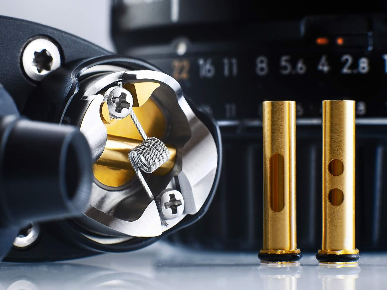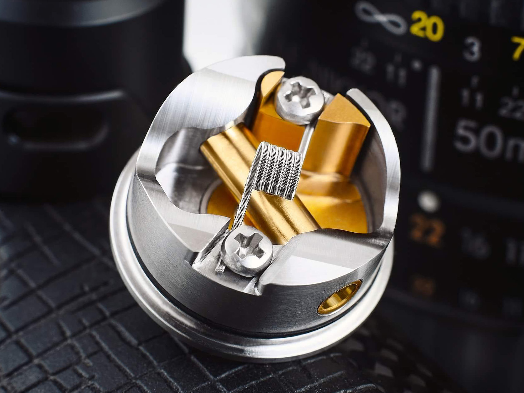 Внутри находится лаконичная база с высокими бортами и двумя платформами, отвечающими за фиксацию спирали. Ножки намотки необходимо расположить в вертикальной плоскости на стойках и прижать сверху винтами с крестовыми шлицами. Подача воздуха на спираль осуществляется снизу, через сменный цилиндр, реализованный в трех версиях с различными перфорациями. Помимо того, интенсивность обдува можно регулировать путем поворота купола относительно базы. Просторное дно вкупе с высокими стенками образуют емкий резервуар для жидкости и укладки хлопка. Предусматривается специальный пин для работы со сквонкерами.