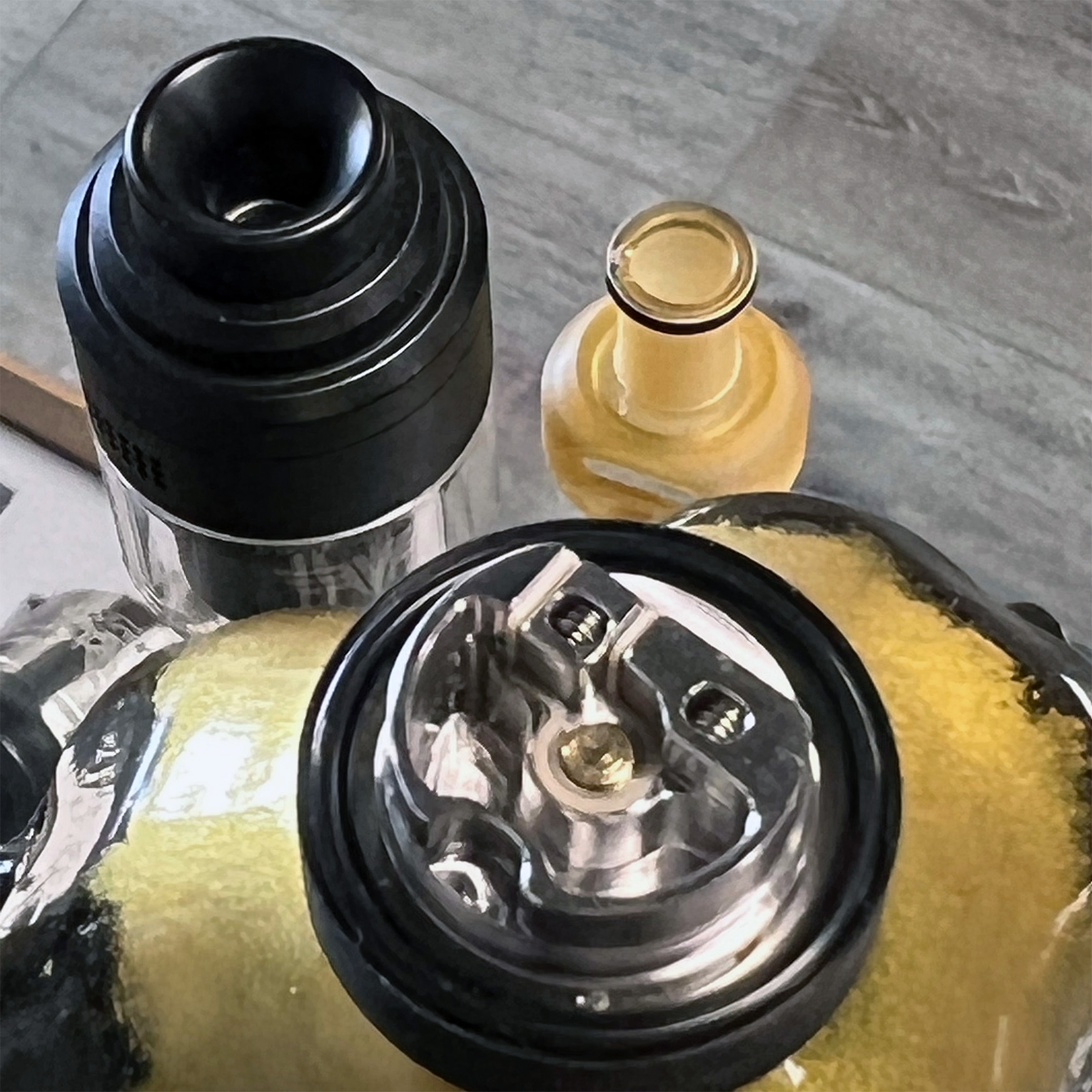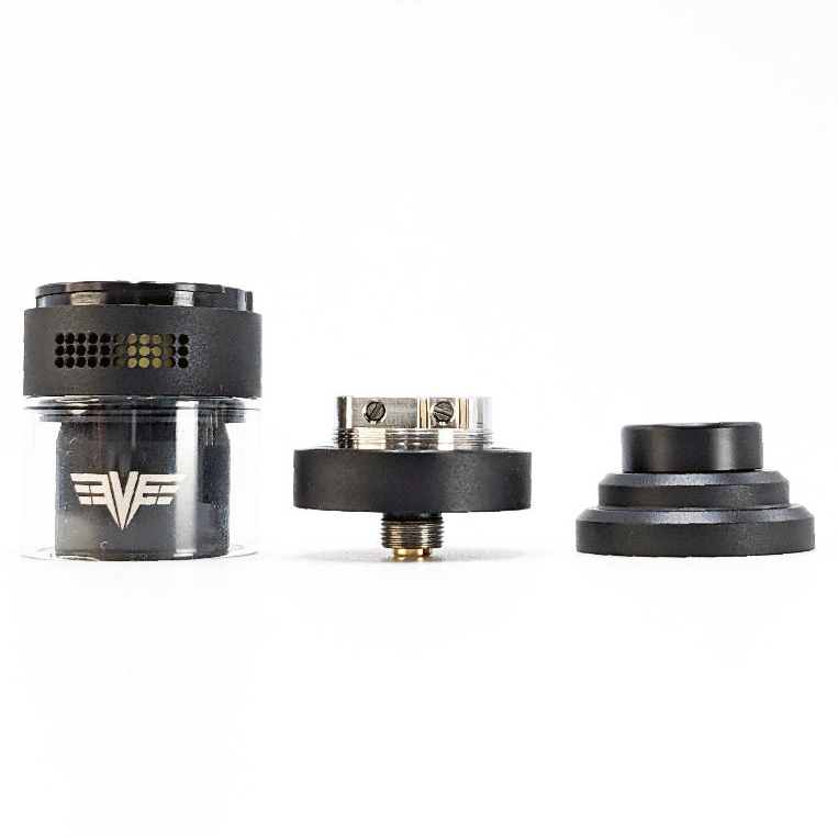 Внутри, на небольшой базе скрывается платформа с крупными слотами для фиксации одной спирали. Ножки намотки необходимо установить сверху вниз и прижать по бокам винтами под прямую отвертку. На противоположной стороне находится емкая ванночка для укладки хлопка. Воздушные потоки подаются на раскаленную спираль через герметичные верхние каналы, надежно защищающие от протечек. Интенсивность затяжки регулируется при помощи вращающегося кольца. Объем составляет 2 мл. В дополнение ко всему, предусматривается альтернативная база, позволяющая уменьшить посадку с 25 до 24 мм.