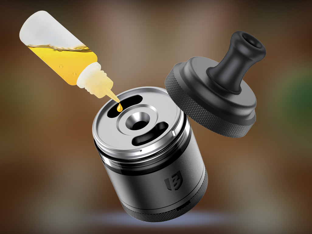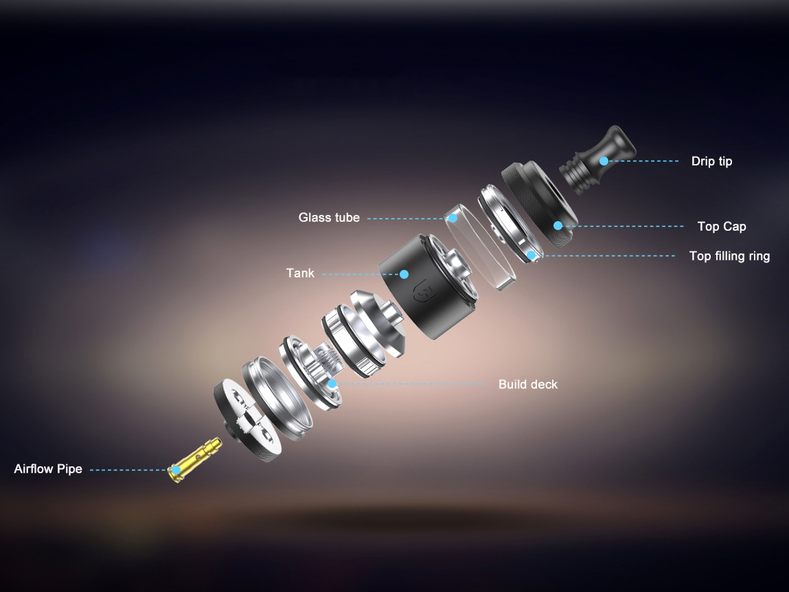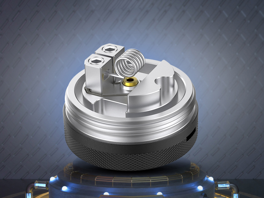 Над компактной базой возвышается пара прямоугольных стоек для установки одной спирали. Ножки намотки необходимо расположить в овальных слотах и зафиксировать сверху шестигранными винтами. За подачу воздуха отвечает съемный позолоченный пин, располагающийся под спиралью в центре деки. На выбор предлагается три вида разнокалиберных сменных вставок. Объем резервуара можно увеличить с 2 до 6 мл при помощи увеличенной колбы и съемного цилиндра. Заправка осуществляется сверху.