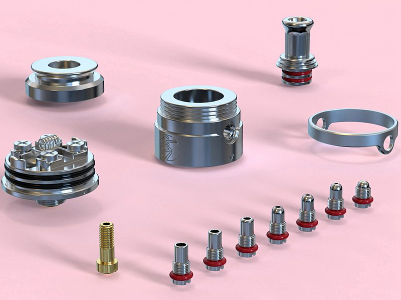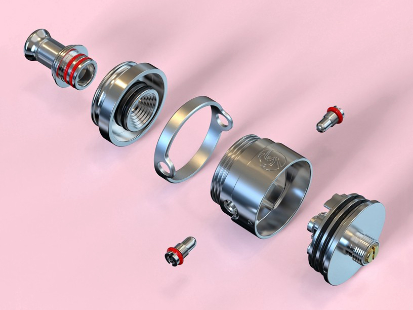 Внутри скрывается просторная база с четырьмя приземистыми стойками под одну спираль. Ножки следует горизонтально установить на просторных платформах и прижать сверху винтами со шлицами под крестовую отвертку. Внутренний купол обладает ступенчатой обработкой под конус, призванной обеспечить оптимальный объем испарительной камеры и вкусопередачу. Вата укладывается в емкие боковые ванночки. Для выравнивания намотки предусматриваются круглые вырезки на бортах. Обдув можно реализовать как в свободном, так и тугом стиле благодаря комплекту из семи разнокалиберных вставок. Вместо стандартного пина можно установить вариант для сквонка.