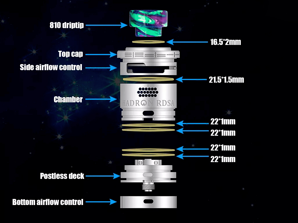 25 марта компания Steam Crave представила на странице в фейсбуке нетривиальную дрипку — Hadron RDSA. Новый девайс обеспечили приземистым стальным корпусом с солидным посадочным диаметром в 30 мм. Вращающийся топкеп дополнили широким 810-м дриптипом из контрастной эпоксидной смолы. Юбку украсили гравировкой и перфорировали двумя воздухозаборными группами, состоящими из множества мелких круглых отверстий. Основание снабдили дополнительным кольцом, отвечающим за отдельные воздушные каналы. Выбор расцветок ограничили двумя версиями — черной и серебристой.