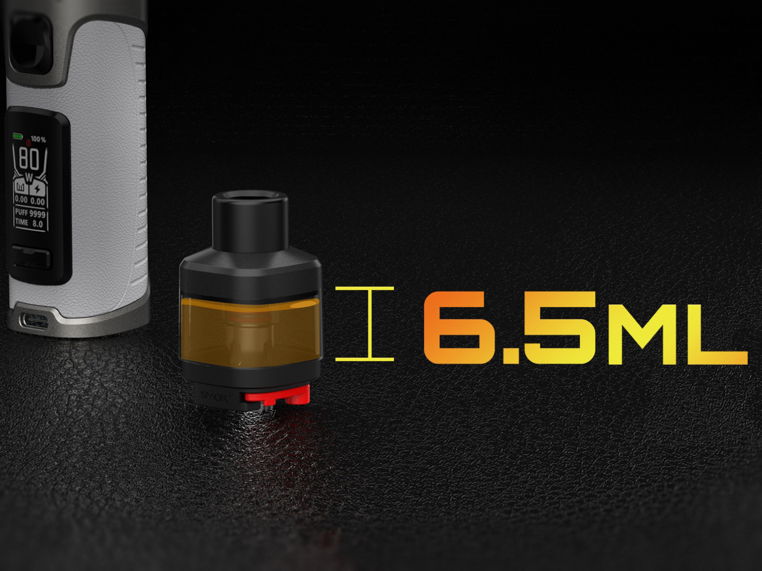 Компанию девайсу составляет вместительный съемный картридж с баком на 6,5 мл и двумя новыми испарителями на усовершенствованных сетках с сопротивлением в 0,15 и 0,23 Ом. Фиксация осуществляется при помощи магнитного коннектора. Заправка производится сверху, через доступное отверстие, скрывающееся под сдвигающимся топкепом. Обдув настраивается посредством регулятора на одной из стенок мода.