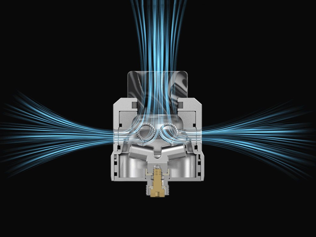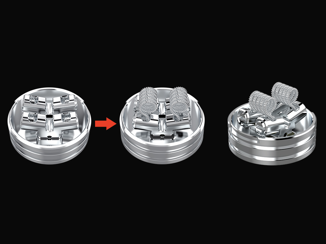 Под куполом располагается вместительная база с двумя Т-образными стойками для установки пары спиралей. Ножки намотки необходимо разместить в вертикальной плоскости и прижать боковыми винтами винтами под прямую отвертку. У основания конструкции находятся каналы, обеспечивающие подачу жидкости при использовании сквонк-пина. Настройка обдува производится путем вращения верхней юбки относительно основного купола. Помимо BF-пина, предусматривается стандартный вариант.