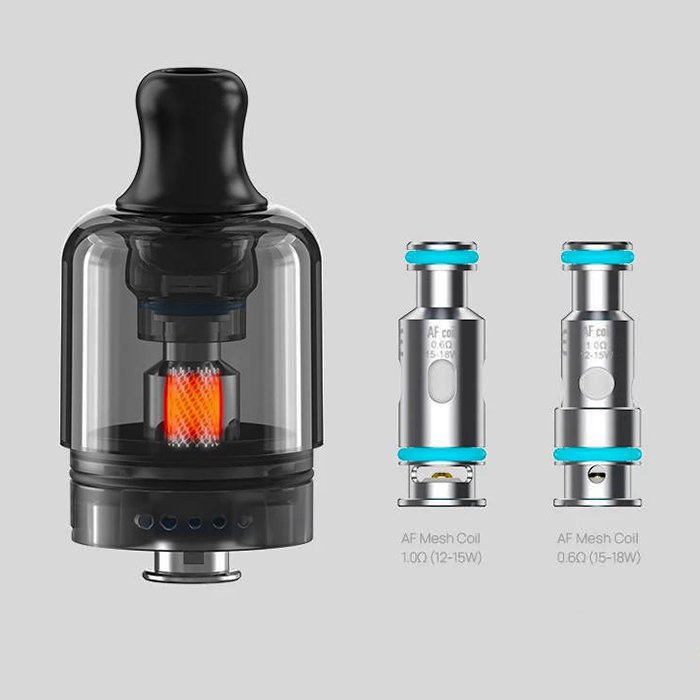 Устройство комплектуется лаконичной платой, позволяющей переключаться между тремя режимами работы в пределах от 12 до 18 ватт. Активацию можно производить при затягивании либо при помощи круглой кнопки. В качестве элемента питания задействуется интегрированная батарея на 1200 мАч. Зарядка производится через USB Type-C порт током в 1А. Картридж работает со сменными испарителями на сетках из серии AF Mesh с сопротивление в 0,6 и 1,0 Ом. Полупрозрачный бак может вмещать 3 либо 2 мл жидкости в зависимости от версии набора. Заправочное отверстие находится на дне резервуара. Обдув настраивается путем вращения картриджа относительно мода.