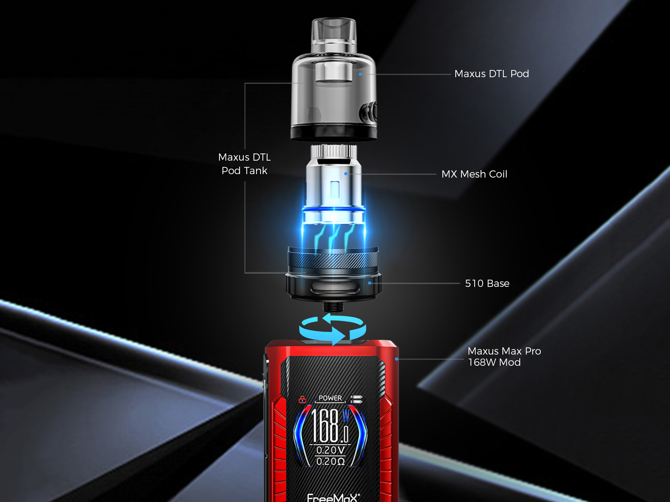 Компания Freemax выпустила Maxus Max Pro Kit. Набор собрали из усовершенствованного мода с коннектором 510, максимальной мощностью в 168 ватт и универсального картриджа на 5 мл.