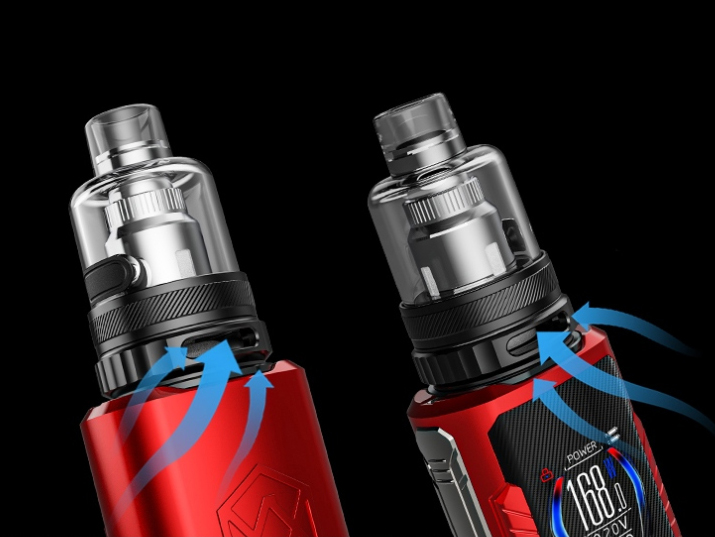 В паре с модом идет универсальный бак Maxus DTL, поддерживающий семь видов сменных испарителей. Базовым набором предусматривается пара сеточных экземпляров на 0,2 и 0,15 Ом с натуральным хлопком. Объем ударостойкого полимерного резервуара составляет 5 мл. Заправка осуществляется через боковую стенку бака. Обдув можно настроить при помощи вращающегося граненого кольца.