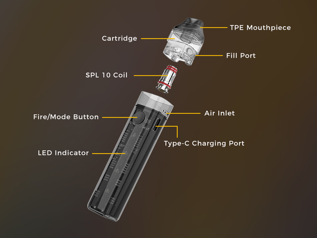 Портативное устройство комплектуется вариативной платой NX chip, поддерживающей все необходимые защитные меры, а также три режима работы. Мощность на выходе может варьироваться в диапазоне от 10 до 30 ватт. Встроенная батарея обладает запасом в 1000 мАч. Полный цикл зарядки через USB Type-C займет полчаса. Съемный картридж поддерживает четыре вида испарителей из линейки SPL. Стандартный набор ограничивается двумя сеточными экземплярами с сопротивлением в 0,6 и 1,0 Ом. Затяжку можно реализовать как свободном, так и в сигаретном стиле путем перестановки картриджа. Объем бака составит 2,8 либо 2 мл в зависимости от версии комплекта.