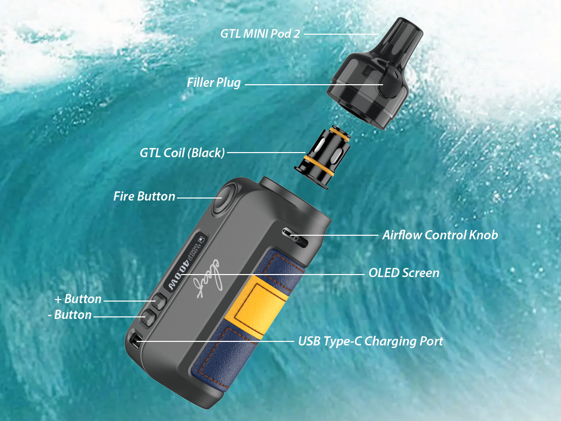 Внутри находится минималистичная, но достаточно функциональная плата, поддерживающая выходную мощность в пределах от 1 до 40 ватт, одноцветный интерфейс и все необходимые меры безопасности. Питание осуществляется за счет интегрированной батарей с запасом в 1500 мАч. Зарядку надлежит производить через USB Type-C током в 2А. Съемный магнитный картридж обладает привычной конструкцией и комплектуется двумя разнообразными испарителями из серии GTL на 0,8 и 1,2 Ом. Бак заправляется через доступное верхнее отверстие и вмещает 2 мл жидкости. Затяжку можно настраивать при помощи ползунка на воздушной перфорации.