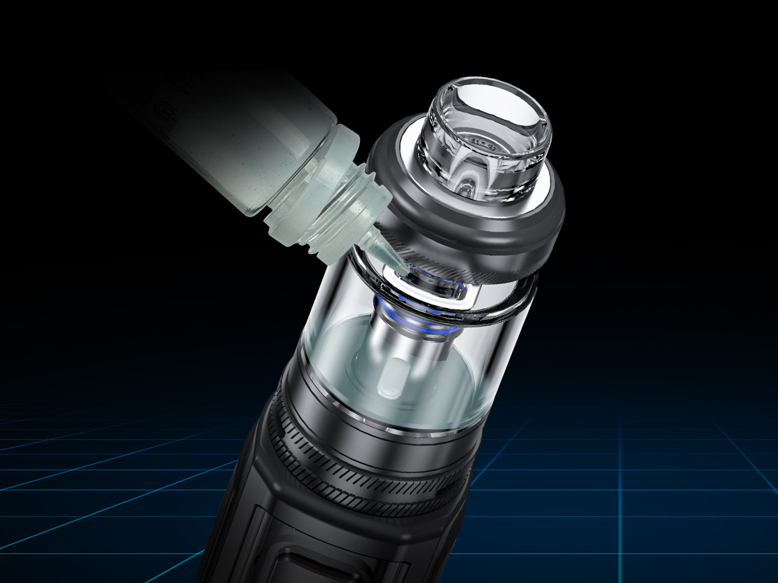 Компанию моду составляет необслуживаемый бак CRC Pod Tank с резервуаром емкостью 5 либо 2 мл и парой сеточных испарителей с сопротивлением в 0,15 и 0,25 Ом. Регулировка обдува осуществляется при помощи стандартного нижнего кольца. Заправочное отверстие находится сверху, под сдвигающейся крышкой.