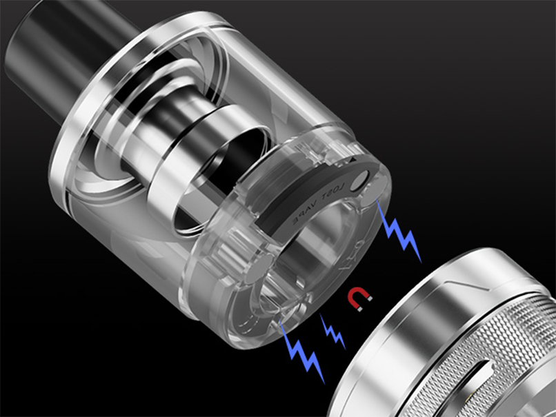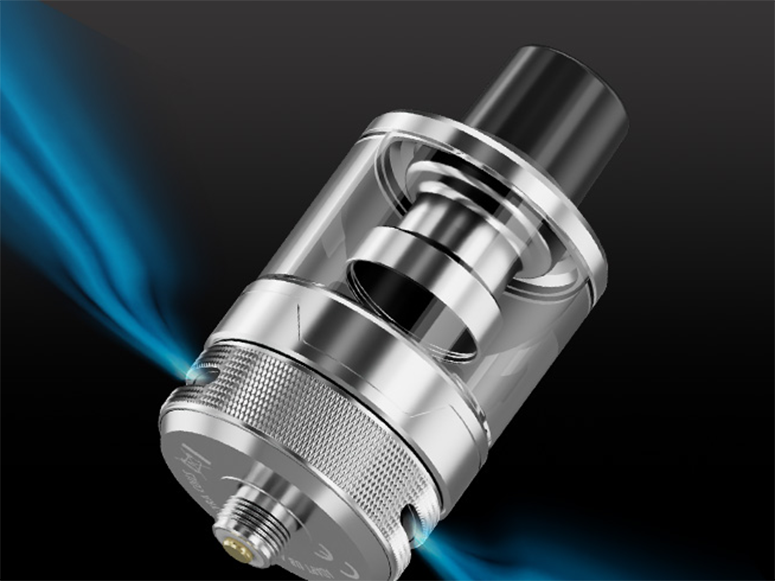 Благодаря отдельной стальной базе и съемной колбе с магнитным коннектором устройство может функционировать как в качестве обычного неосблуживаемого бака, так и в качестве картриджа. Объем резервуара составляет 5 мл. Заправочное отверстие располагает на дне бака, под герметичной откидной заглушкой. Внутри находится предварительной установленный испаритель из новой серии UB Max с сопротивлением в 0,15 Ом. Кроме того, в запасе имеется дополнительный экземпляр из той же линейки на 0,3 Ом. Интенсивность обдува регулируется посредством вращающегося кольца.