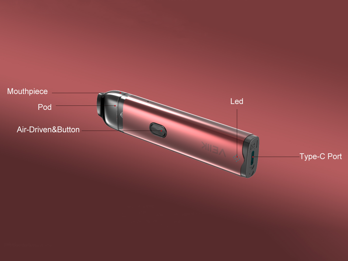 В июне 2022 китайская компания VEIIK представила на своем сайте очередную под-систему — Vicko Pod Kit. Новое устройство изготовили из легкого алюминиевого сплава и прочного термостойкого пластика в пяти монотонных расцветках. Лаконичный вытянутый корпус обеспечили минималистичной конструкцией без излишеств и облагородили тонким профилем со скругленными гранями. В центре лицевой стороны установили овальную кнопку активации. Ниже разместили цветной индикатор заряда и нанесли контрастный логотип. По торцам распределили пару мелких воздухозаборных точек. Картридж снабдили эргономичным съемным мундштуком и крупным окном для контроля уровня жидкости. USB-порт отправили на срезанное дно.