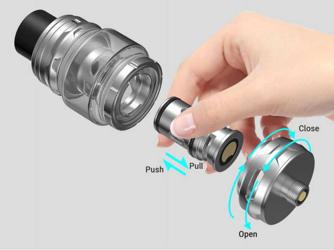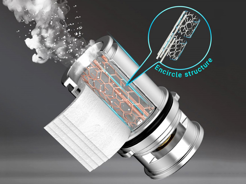 Внутри, на необслуживаемой базе находится предварительно установленный сменный испаритель E1 на 0,16 Ом, снабженный двумя сетками с шестигранным плетением. Кроме того, в качестве альтернативы предусматривается ещё один экземпляр с четырьмя параллельными сетками с сопротивлением в 0,14 Ом. Интенсивность обдува можно детально настраивать при помощи нижнего кольца. Стандартную колбу на 3,5 мл можно заменить расширенной версией с объемом в 5 мл.