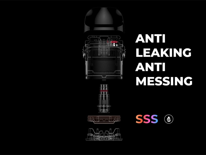 За питание под-системы отвечает вместительный интегрированный аккумулятор емкостью 1000 мАч. Для быстрой зарядки током в 1А предусматривается USB Type-C. Съемный магнитный картридж отличается фирменной технологией SSS Anti-Leaking, обеспечивающей надежную защиту от протечек. Сменные испарители реализуются в двух экземплярах на сетках с сопротивлением в 1,0 и 0,6 Ом. Помимо того, предусматривается совместимость с картриджами из предыдущей серии. Обдув можно переключать путем перестановки резервуара.