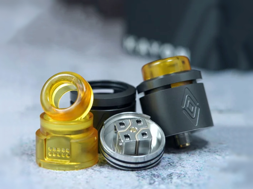 Внутри, в центре базы разместили квадратную конструкцию с четырьмя овальными слотами для установки пары спиралей. Ножки намотки следует расположить в вертикальной плоскости и зажать по бокам винтами под прямую отвертку. Для сокращения объема испарительной камеры и эффективной подачи воздуха предусматривается дополнительный съемный купол из термостойкого пластика. Интенсивность затяжки настраивается путем вращения крышки. Высокие борты вкупе с просторной декой образуют вместительный резервуар. В дополнение ко всему, стандартный пин можно заменить на вариант для сквонка.