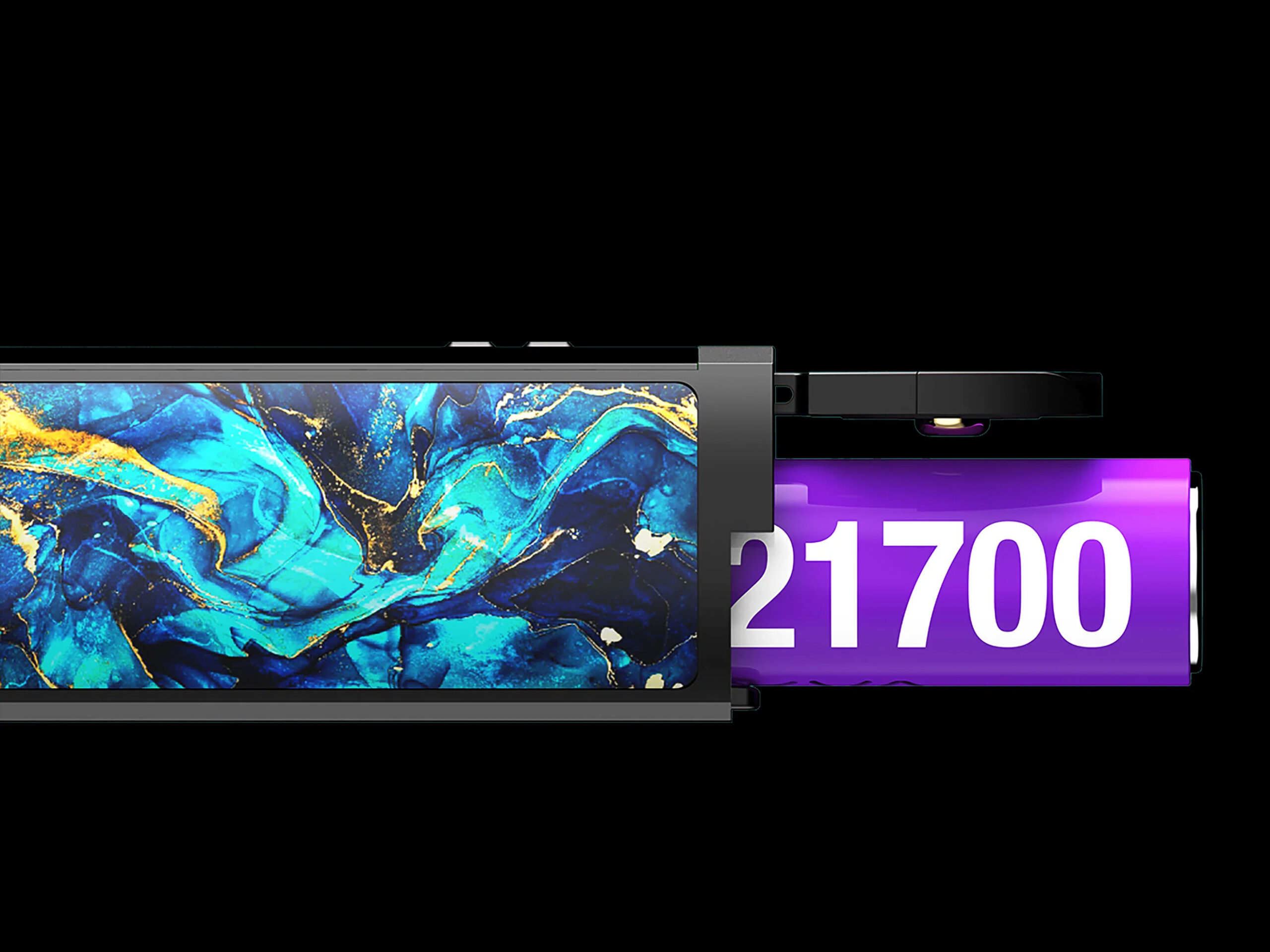 Работа может осуществляться в широком диапазоне мощности от 5 до 100 ватт, а также варьвольте и альтернативном режиме Smart с автоматической оптимизацией. Для питания можно использовать три формата аккумуляторов — 21700, 20700 либо 18650. Зарядку током в 2,5А надлежит производить через USB Type-C. Резервуар картриджа вмещает 5 мл жидкости. Интенсивность обдува настраивается при помощи кольца на дне бака. Заправочное отверстие скрывается сверху, под герметичной крышкой.