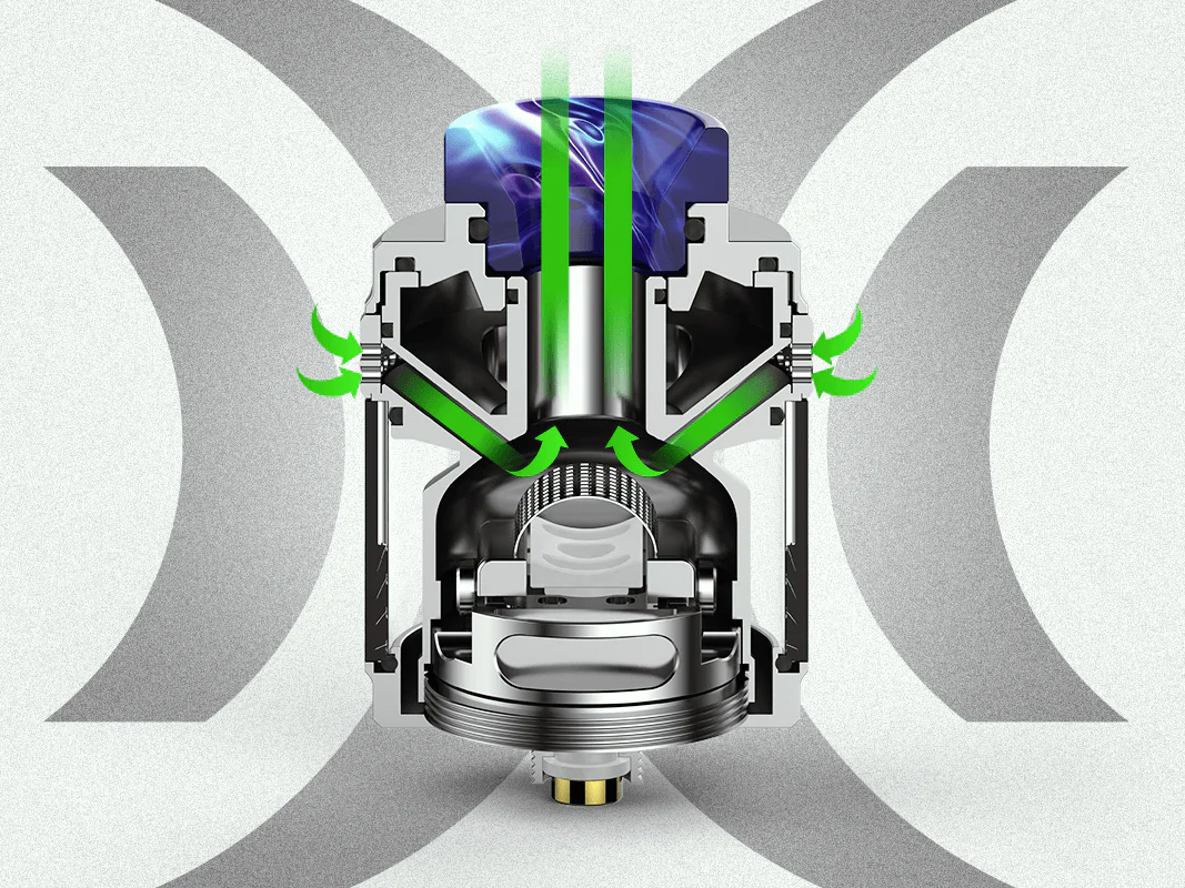Базу представляет массивная прямоугольная конструкция, состоящая из пары широких прижимных пластин, керамической платформы для хлопка и четырех слотов. При установке сетки, концы необходимо разместить между пластинами и зафиксировать при помощи винта под крестовую отвертку. В случае со спиралью, ножки намотки следует вертикально разместить в отверстиях и прижать маленькими боковыми винтами. По периферии предусматриваются крупные сквозные резервуары для укладки концов ваты. Заправка осуществляется сверху, через углубленную площадку под съемной крышкой. Стандартную цилиндрическую колбу можно заменить расширенной версией на 8 мл.