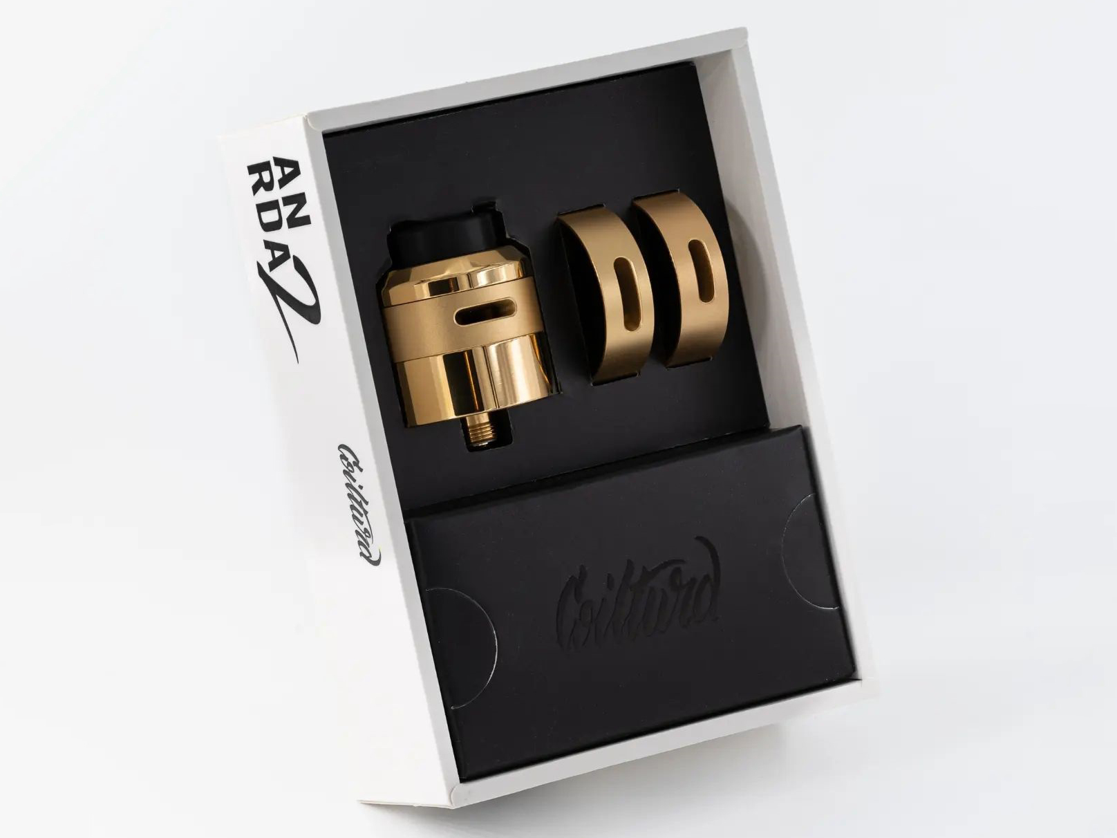 Компания Coilturd выпустила An RDA 2. Это двухспиральная дрипка с четырьмя позолоченными стойками, комплектом сменных колец для детальной настройки обдува и пином для сквонка.
